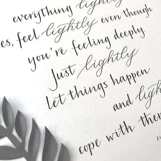 I focus on my breath and try to inhale on the upstrokes and exhale on the downstrokes. Give it a go and see if you can almost use your breath to move your pen. This will have a transformative effect on your lettering by encouraging you to relax and discourage you from holding your breath - something we are all guilty of - me included!